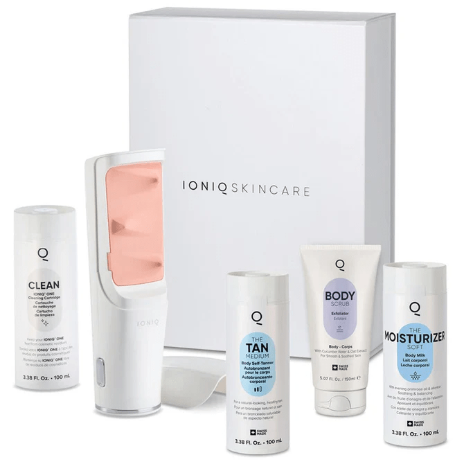 Elevate your routine with the Full Experience Bundle, combining advanced technology and clean, high-performance formulas. The IONIQ ONE at-home spray tan system uses Magnetic Skin Technology for a seamless, touchless application and even, mess-free coverage.